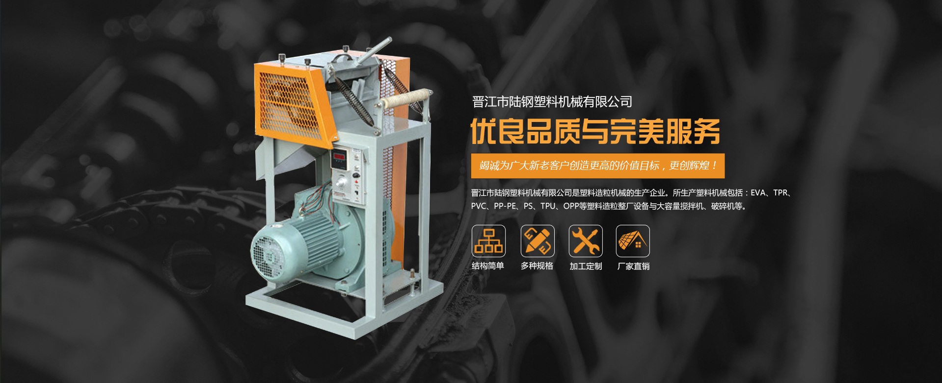 晉江市陸鋼塑料機械有限公司是塑料造粒機械的生產企業。所生產塑料機械包括:EVA、TPR、PVC、PP-PE、PS、TPU、OPP等塑料造粒整廠設備與大容量攪拌機、破碎機等。